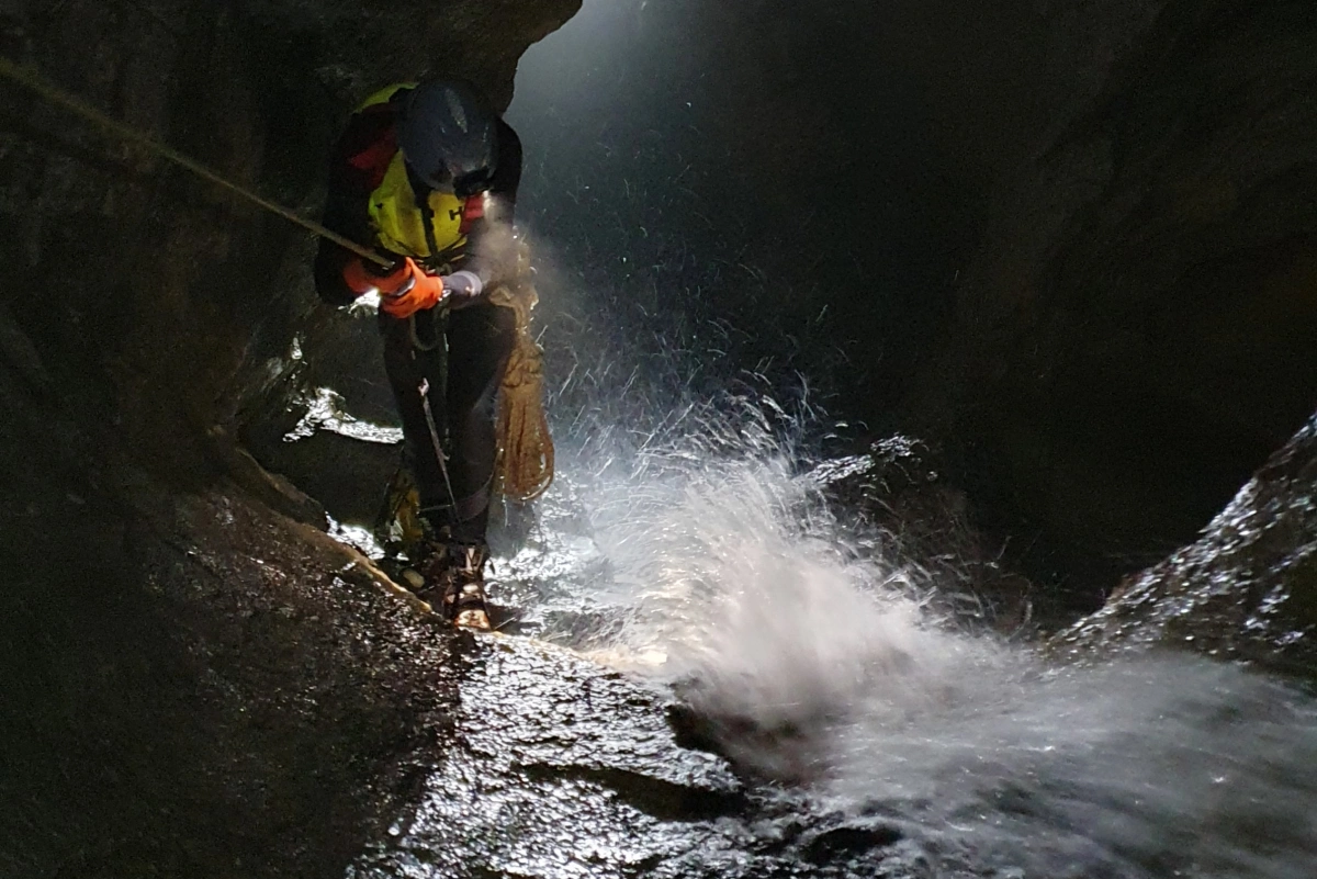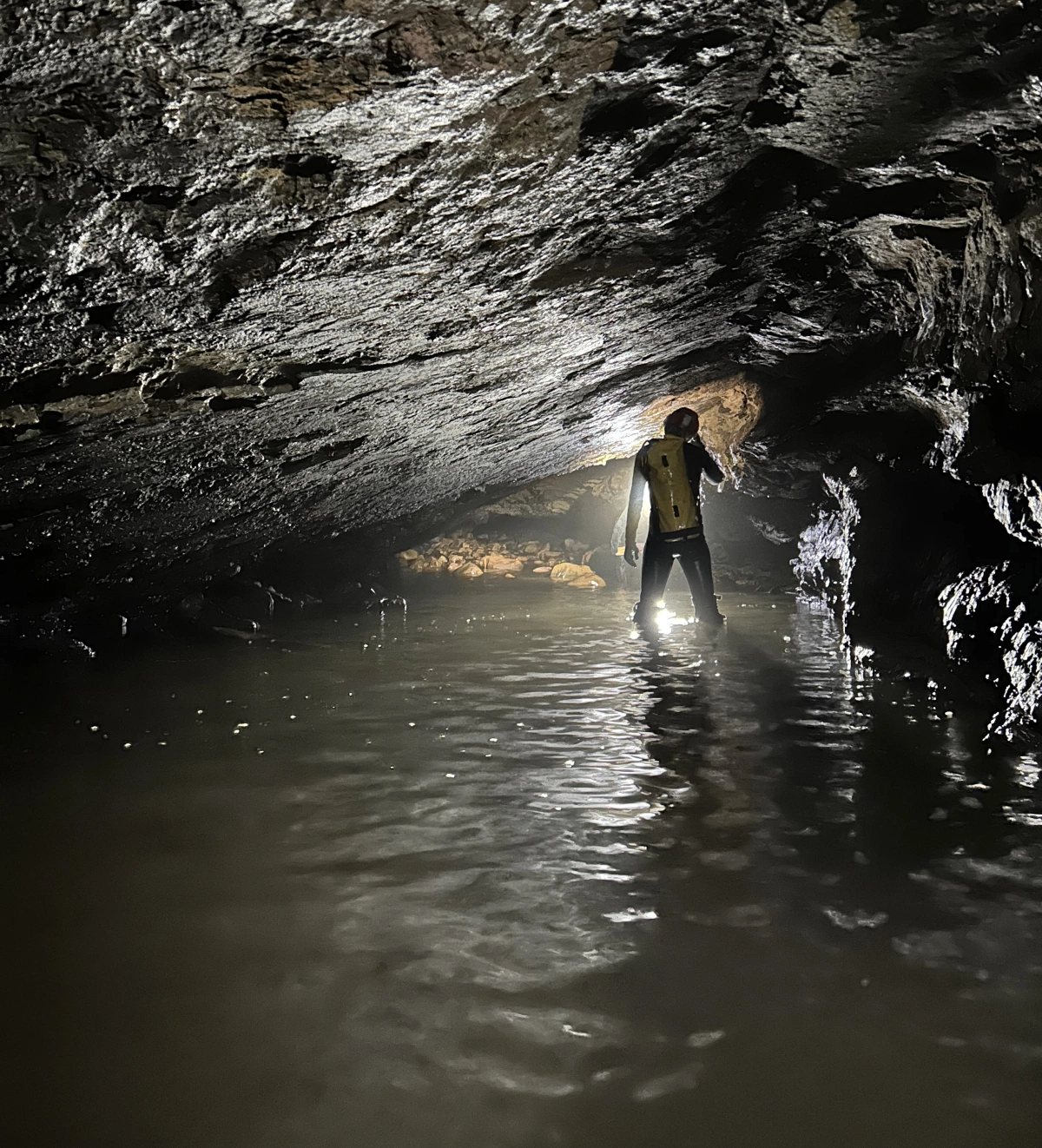 Несмотря на сухой сезон с малым количеством осадков, внутри пещеры протекал мощный поток.